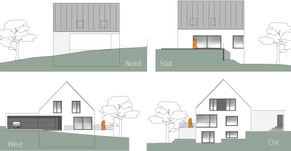 Unter dem Dach sind die Schlafräume so untergebracht, dass diese optimal auf die Bedürfnisse der Bewohner angepasst sind. Die Hanglage ermöglicht es, im Keller ein Gästezimmer/Hobbyraum mit Ausgang in den Garten unterzubringen.