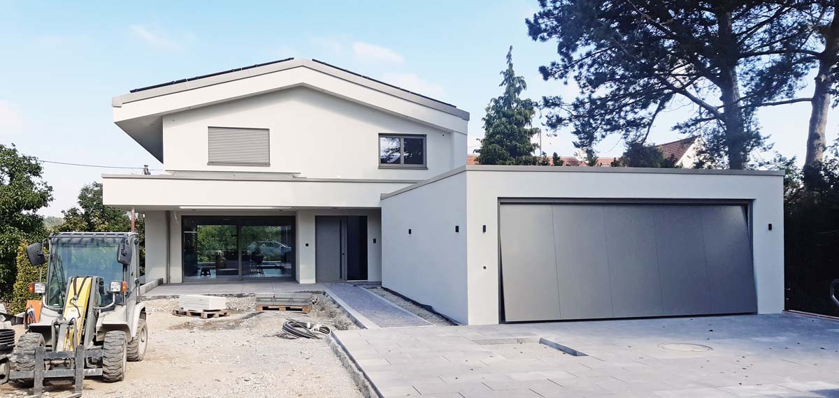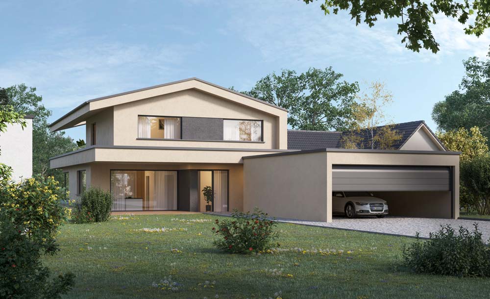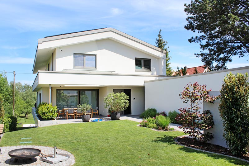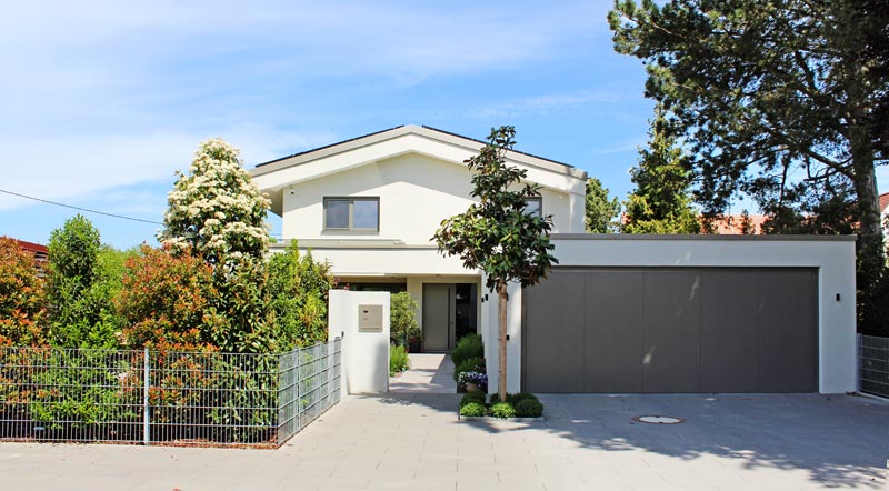 Die weitläufige Anlage des Hauses ist von der Eingangsseite nicht zu erahnen. Der Eingangsbereich dieses exklusiven Einfamilienhauses ist in Richtung Süden ausgerichtet. Über die Doppelgarage gelangt man dank einer Überdachung zwischen Garage und Haus trockenen Fußes ins Gebäude.