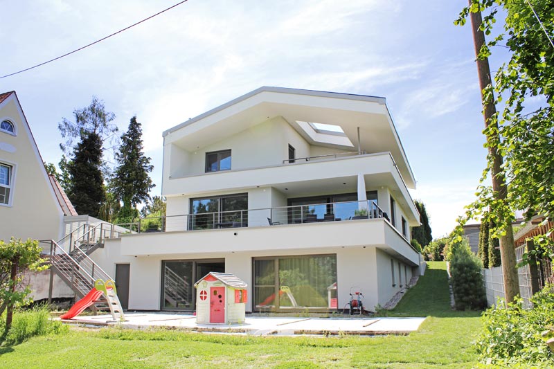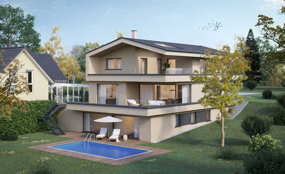 Das realisierte Haus schmiegt sich in leichter Hanglage in das Grundstück ein. Dadurch ergeben sich im Untergeschoß große Fensterflächen, die den in Blickrichtung Garten gelegenen Schlafbereich der Eltern sehr luftig und offen empfinden lassen. Der im Garten angelegte Pool lädt zur Erfrischung ein.