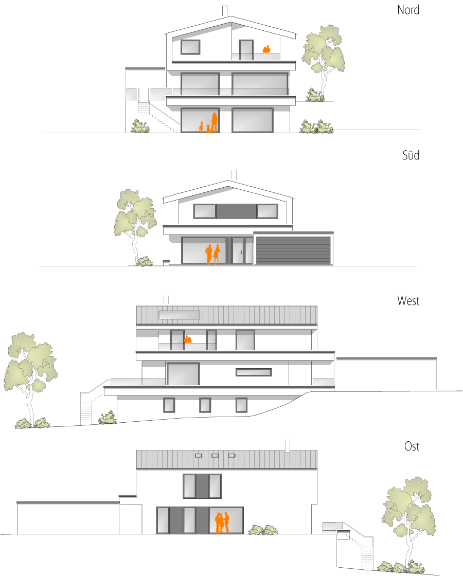 Den Kindern stehen unter dem schrägen Dach große Räume nebst einem eigenen Badezimmer zur Verfügung. Die Überdachung der Terrasse im Obergeschoss erhält einen Dachausschnitt, um die abendlichen Sonnenstrahlen nicht einzuschränken.