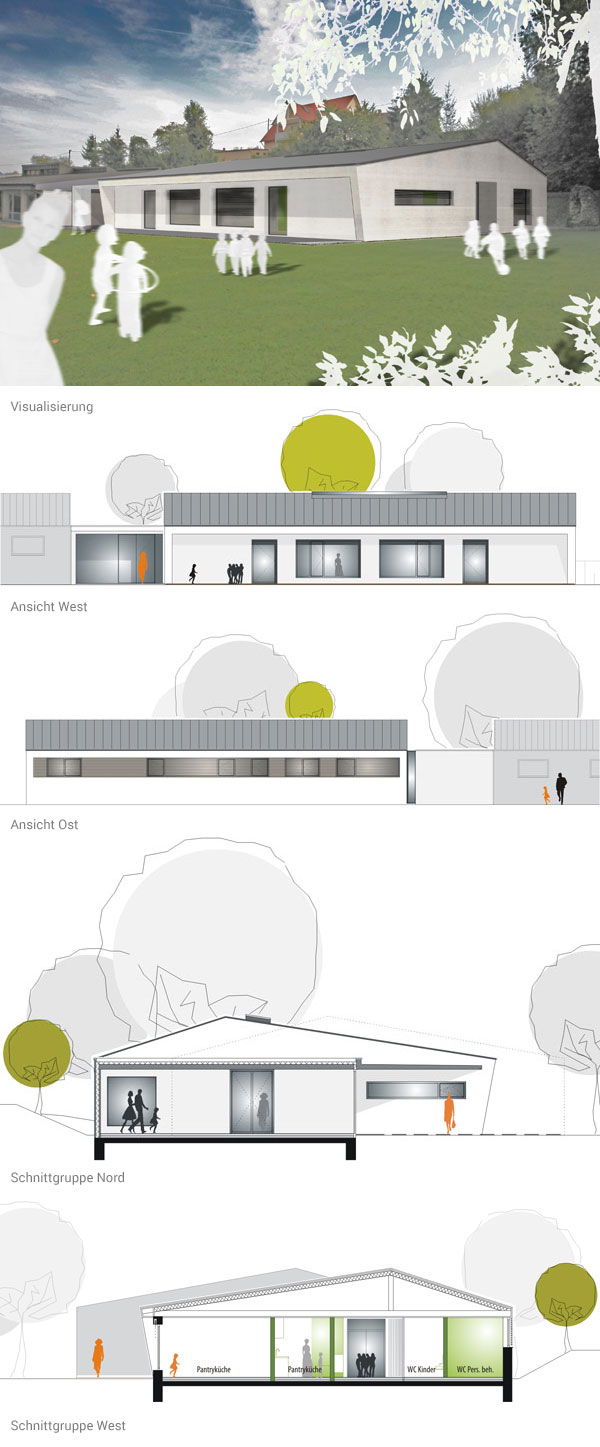 Der Baukörper orientiert sich am Bestehenden und interpretiert die vorhandene Baustruktur. Der Versatz der Anlage schließt das Gesamtkonzept der Anlage formal ab. Der Besuchereingang wird am Ende der äußeren Erschließungsachse nun klar definiert.