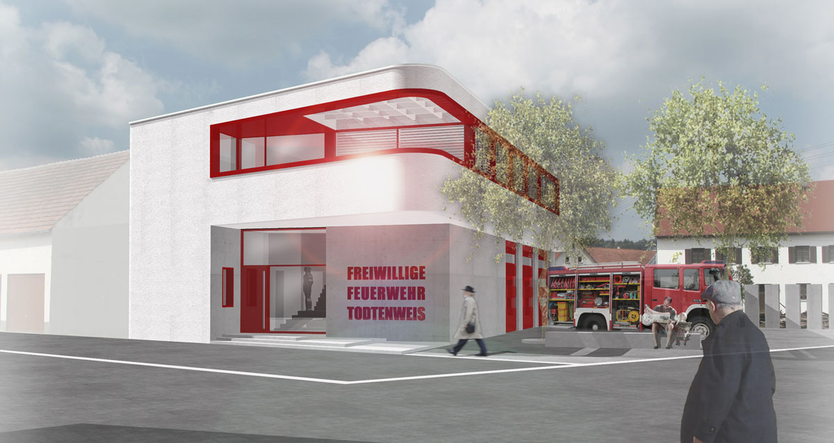 Für das bestehende, zu kleine Feuerwehrgebäude der Gemeinde Todtenweis sollte ein Ersatzbau in direkter Nachbarschaft zum Rathaus entstehen.
